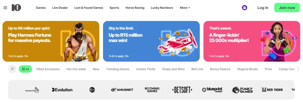 10bet South Africa works with well-known international studios, so you get familiar titles and certified RNG games. The main casino and live-dealer providers currently include: