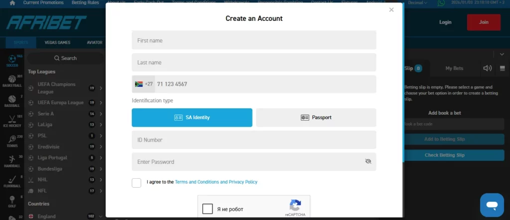 Registering on Afribet is simple and takes only a few minutes. Both desktop and mobile versions use the same form, and the steps are nearly identical. The operator requires only basic information to create an account, as required by South African regulations.