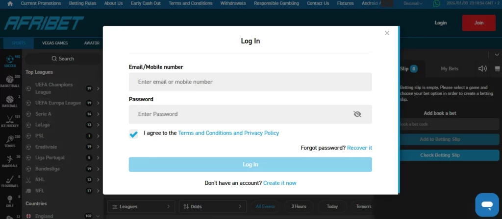 Logging in to Afribet requires only your mobile number and password. The process is the same on both desktop and mobile versions. Once logged in, you can access betting markets, your account settings, and payment options.