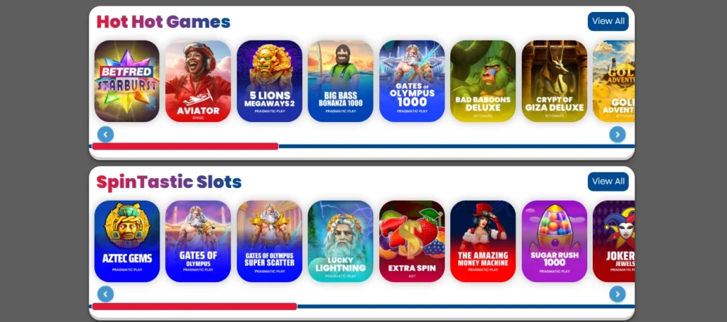 Betfred South Africa hosts content from well-known studios. Slots are supplied mainly by Pragmatic Play and AGT, which cover many of the headline titles in the casino lobby.