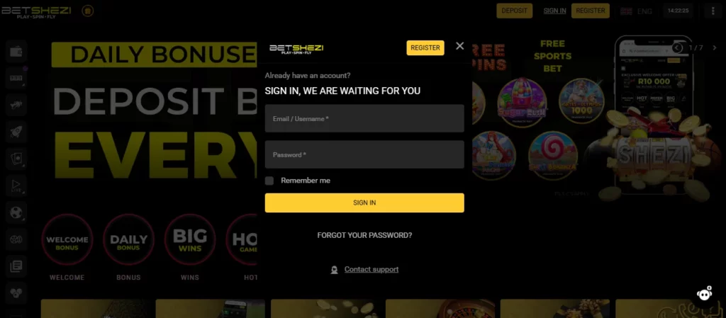 Logging in at Betshezi takes only a few seconds. The process is identical on desktop and mobile, making it convenient for users switching between devices.