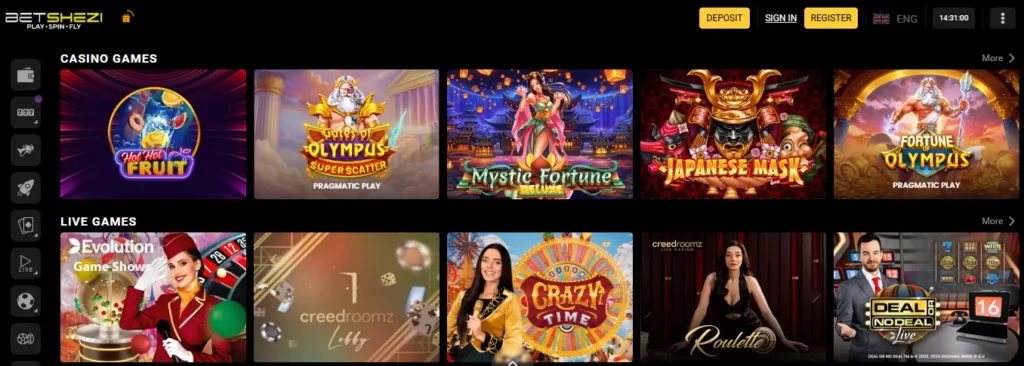 | Type of Games | Betshezi offers a mix of online casino games (slots, table games, live dealer games), virtual games / “lucky numbers”, casino-style games, and a sportsbook. |