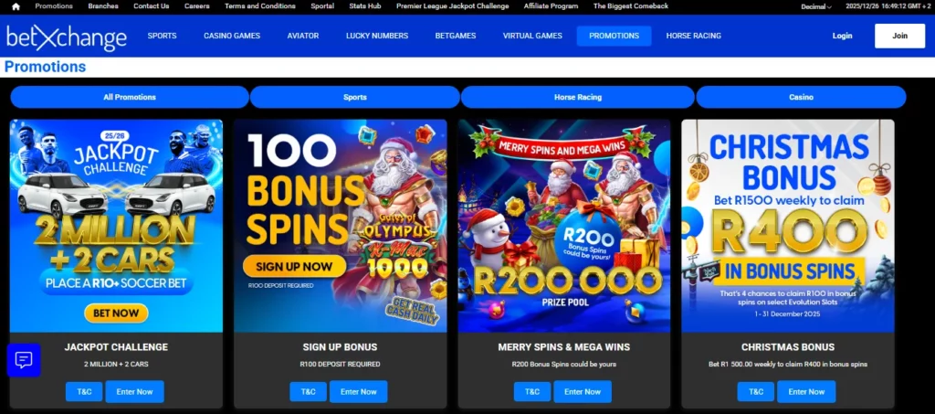 No. BetXChange does not provide online casino games, slots, or free spins. South African law allows only sports betting, horse racing, Lucky Numbers, and limited betting products. Because of this, the brand focuses on sports markets, accumulator boosts, racing pools, and number-based draws instead of casino content.