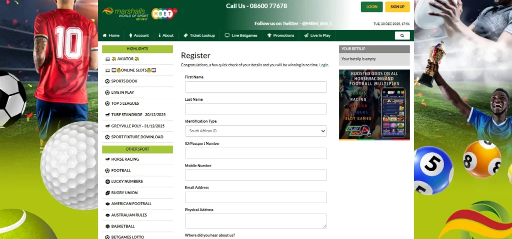 Opening an account at Marshalls World of Sport takes only a few minutes, both on desktop and on your phone. You only need basic personal data, a South African mobile number and an email address.