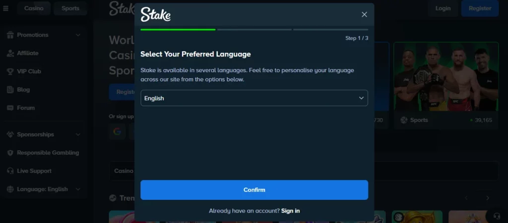 Creating an account on Stake is quick, with only a few required fields. Both the desktop and mobile versions follow the same logic, but the layout differs slightly.