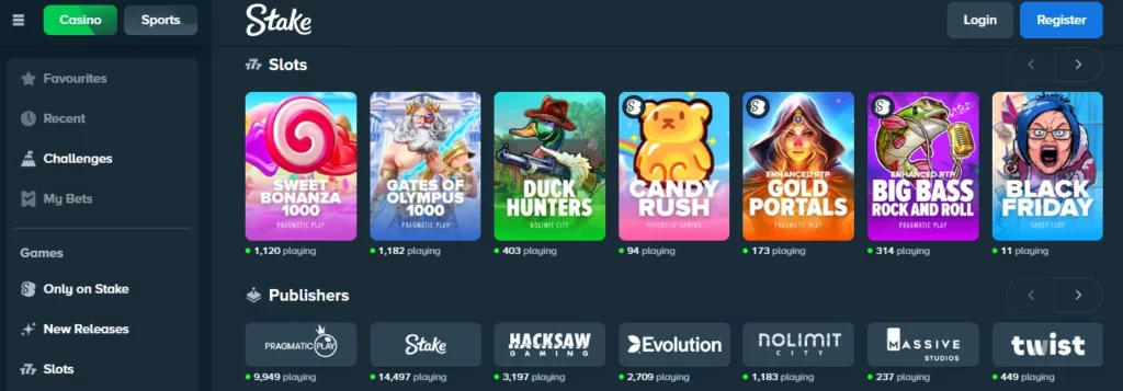 Stake collaborates with a large number of reputable casino game providers. This ensures a broad game selection, including slots, live shows, table games, and Stake Originals.