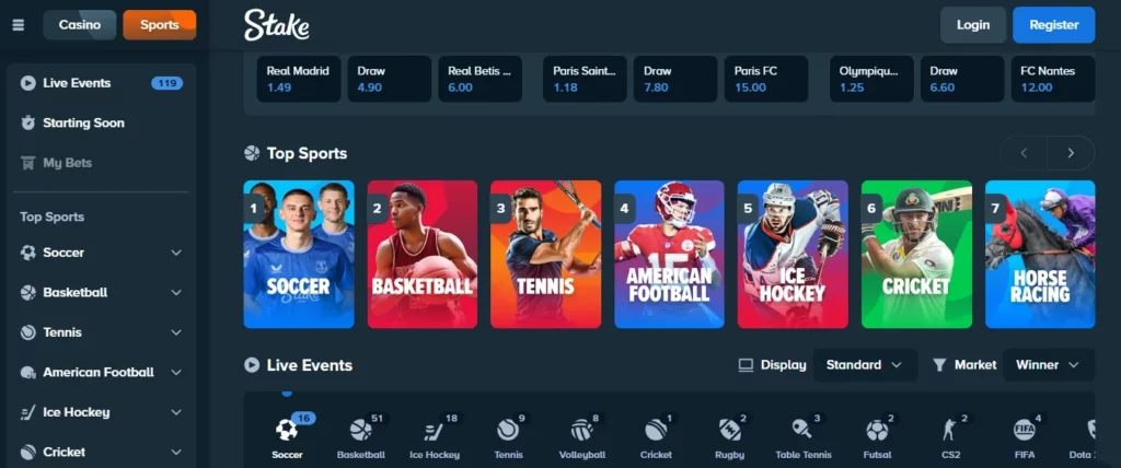 Stake offers an extensive range of sports and markets, including football, tennis, MMA, motorsports, and eSports, often with competitive odds. The platform supports both pre-match and live betting, with fast market updates and intuitive navigation. Cryptocurrency payments also provide quicker deposits and withdrawals than traditional banking methods, making Stake a flexible and modern alternative for bettors.