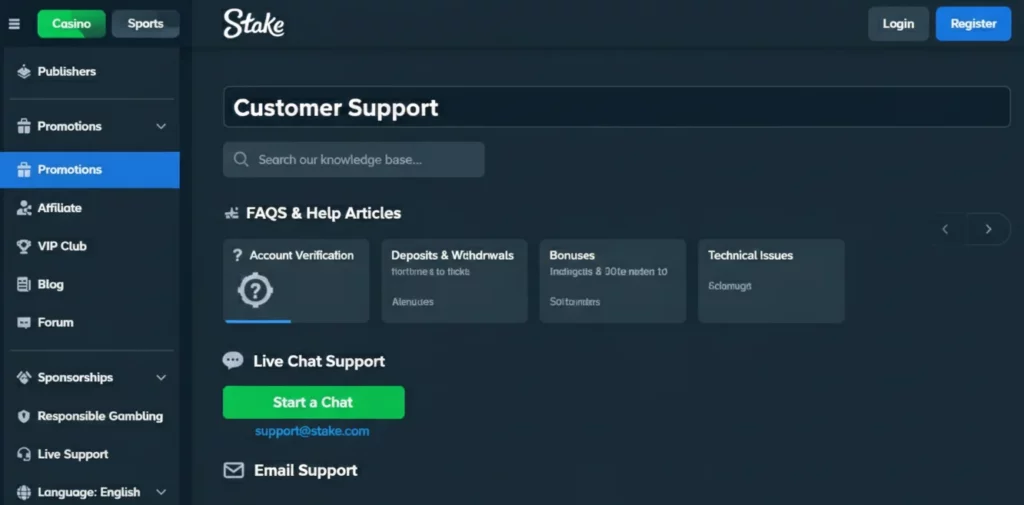 - If the issue persists, contact Stake’s 24/7 live chat.